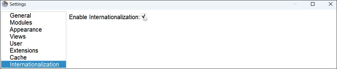 - 请在菜单 Edit → Application Settings → Internationalization 中查找。“Enable Internationalization” 勾选框位于此处。