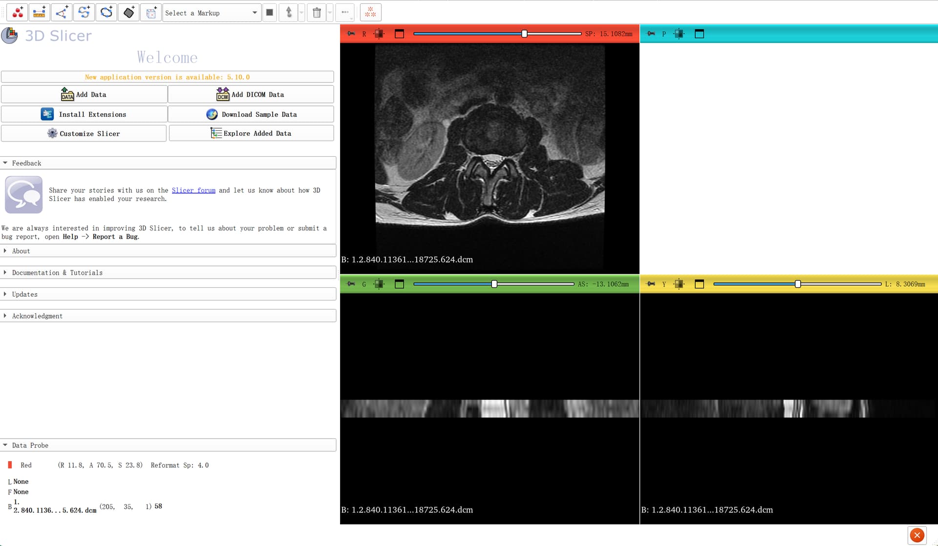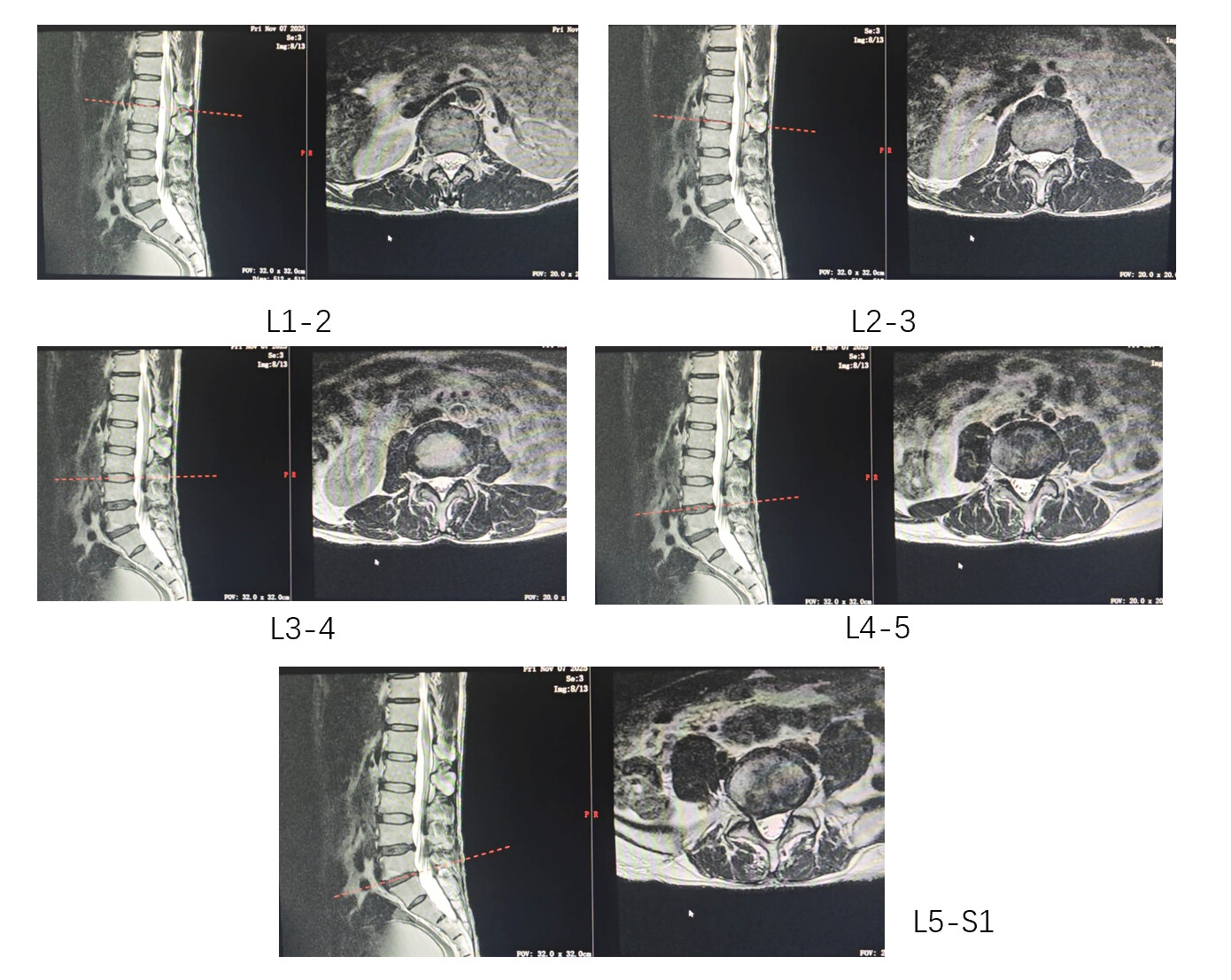 我有一组腰椎核磁的横断面图像,旨在分析五个椎间盘节段(L1/2, L2/3, L3/4, L4/5, L5/S1)。每个节段都包含2-4张DICOM图像。