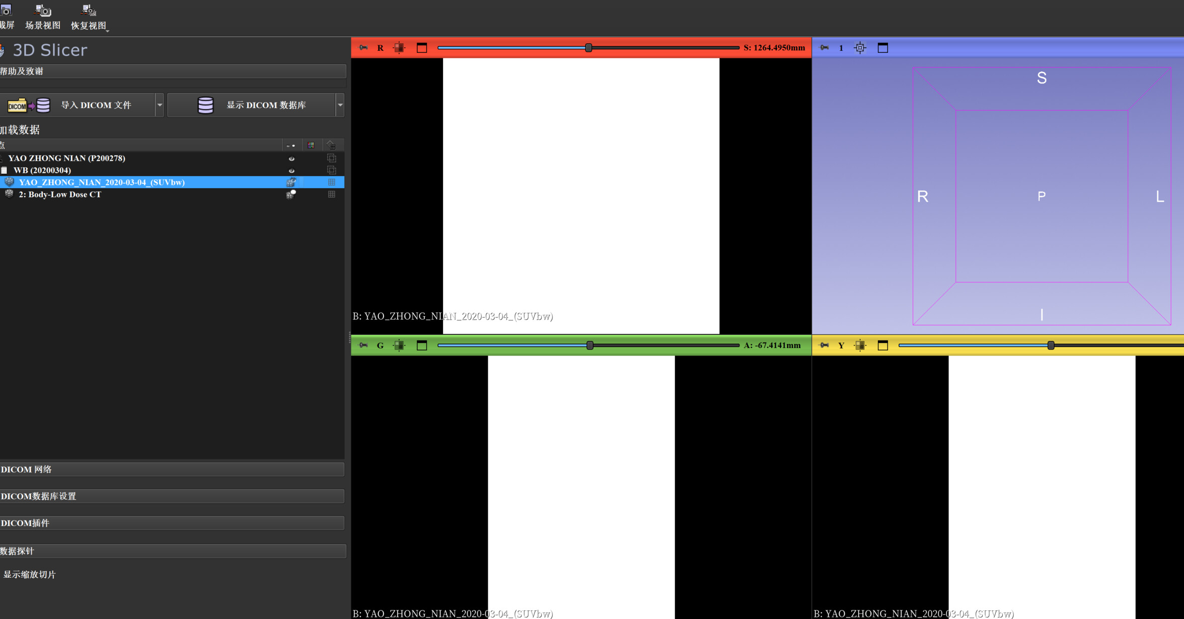 你可以先按“右键拖动 + Volumes 模块自动窗宽/窗位 + 看 scalar range”这三步试一下,如果仍然是纯白,截一个 Volumes 模块的界面(包含 Scalar range 和窗口设置)给我,我帮你再具体判断是显示问题还是 SUVbw 数据本身出了问题。